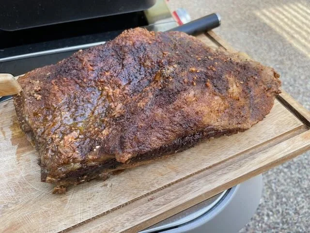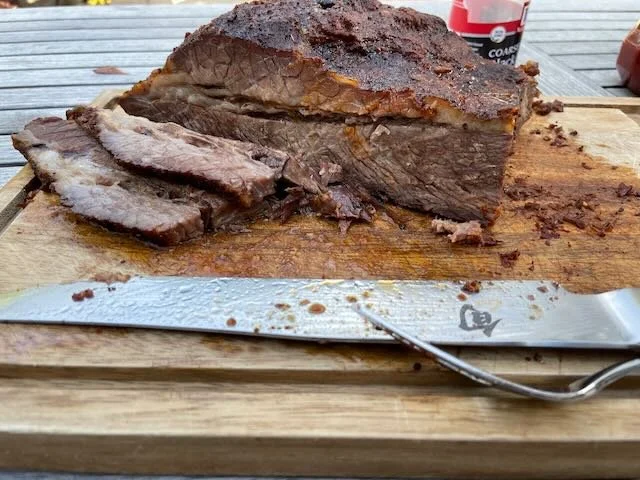 27.11.2022: Inspiriert vom amerikanischen BBQ habe ich am Sonntag eine Rinderbrust (brisket) zubereitet. Für das Deutschlandspiel hatten wir ein paar Freunde eingeladen und so war es eine gute Gelegenheit. Nach unserer Zeit hat das Spiel im 11h am begonnen. Also Brisket zum Mittagessen war der Plan. So bin ich tatsächlich an diesem Sonntag schon um 6h morgens aufgestanden um zu grillen. Bisher war ich für so etwas nicht motiviert. Nun kann ich sagen: Es hat sich gelohnt ;-) Die Rinderbrust hatte ich schon Ende letzte Woche beim neu entdeckten Fleischer unseres Vertrauens gekauft und am Vorabend mit Senf und einer Würzmischung eingerieben. Für das langsame Garen bzw. Räuchern musste ich erst einmal das richtige Holz auswählen und verstehen wie ich aus einem Gasgrill einen Smoker machen kann. Hat in Summe alles ganz gut geklappt, so dass wir dann nach dem Spiel leckeres, vor allem zartes Fleisch hatten. An den Smoking Armen muss ich noch etwas arbeiten…