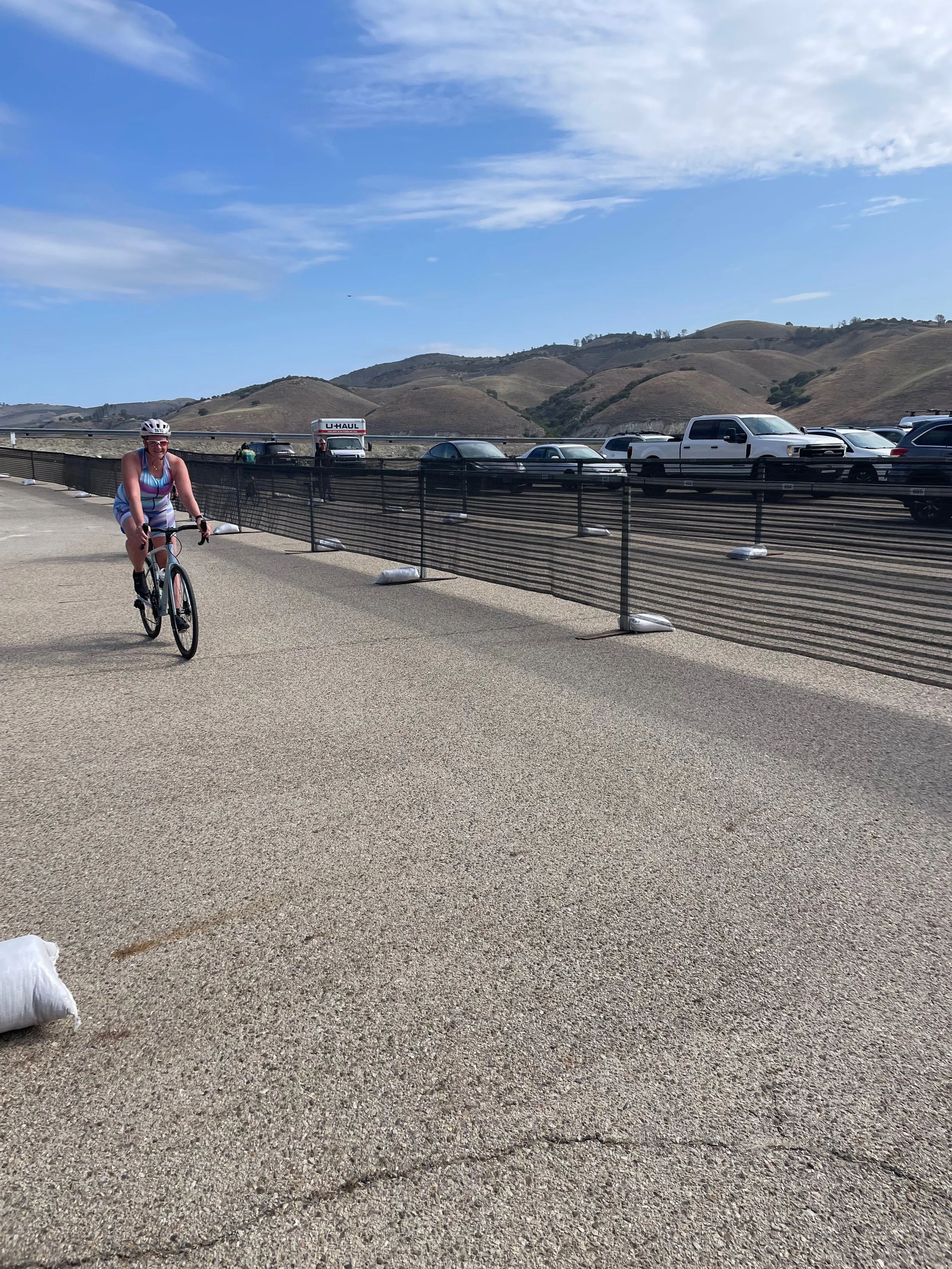 Samstag ging es dann für mich mit einer recht “späten” Startzeit von 8h morgens los mit 1,9km Schwimmen im Lake San Antonio (angenehme Wassertemperatur), anschließend einer Rad Runde um den See (90km, 1125Hm) und einem Halbmarathon. Es war schön, dass alle dabei waren. So hatte ich viel Unterstützung an genau den richtigen Stellen so dass ich ganz vernünftig in 05:14 Stunden durchgekommen bin. Immerhin habe ich es noch aufs Treppchen in meiner Alterklasse geschafft. Den Rest des Tages haben wir dann noch entspannt auf dem Festivalgelände verbracht. Abends haben wir dann obligatorisch beim Feuer noch Smores gemacht. Einzig Camping untypisch war dass Katrin und ich Nudeln zum Abendessen hatten. Ich am Freitag (als Energie für Samstag) und Katrin am Samstag (als Energie für Sonntag).