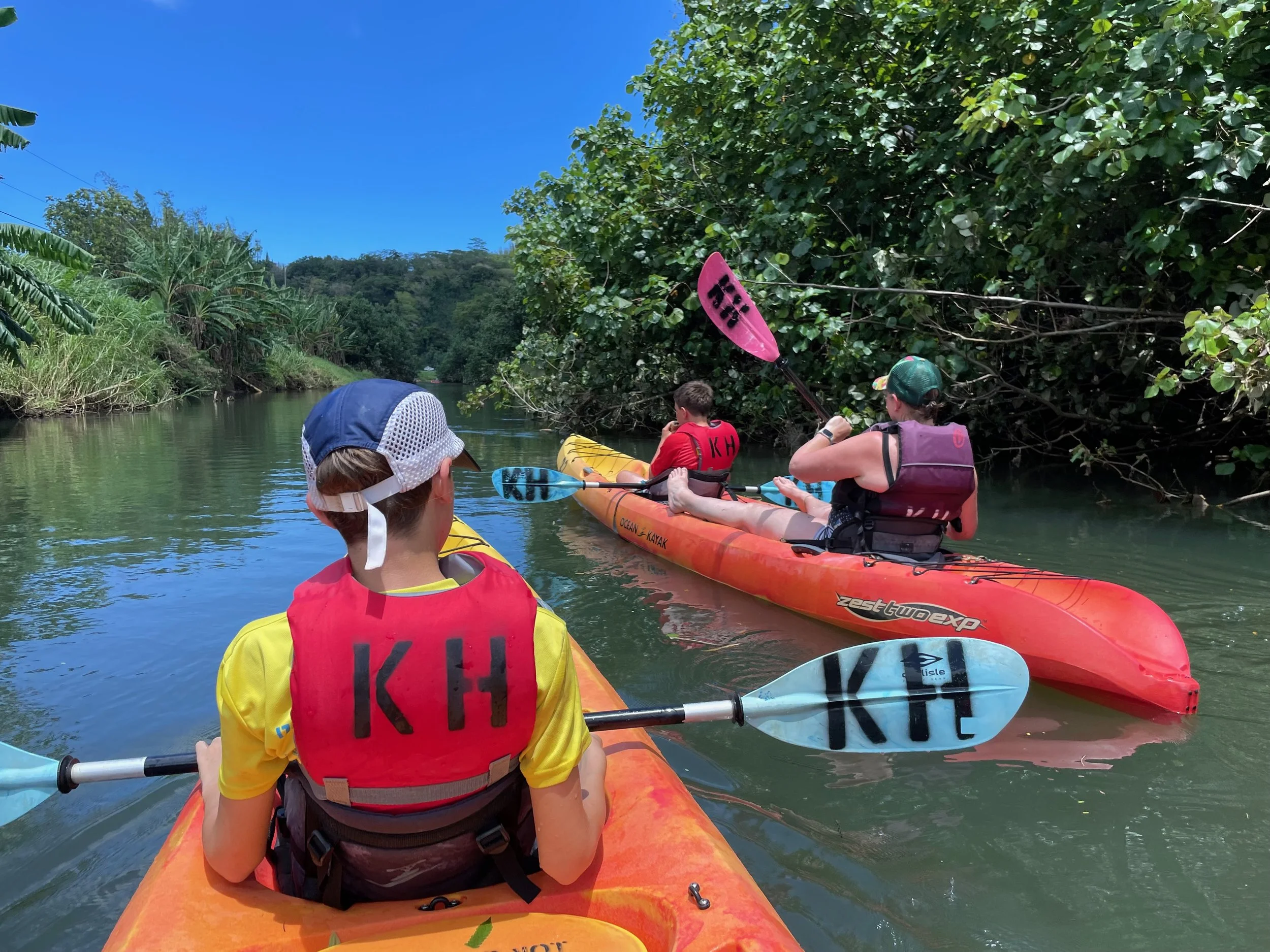 Ostersonntag haben wir nach der Anstrengung des Vortages entspannt angehen lassen. Was natürlich nicht bedeutet dass wir nichts gemacht haben ;-) Die Jungs haben sich gewünscht dass wir Kayak fahren gehen. Gesagt, getan. Bei einem Verleih nicht weit weg haben wir uns 2 Kayaks geliehen und sind zunächst Flussaufwärts gepaddelt. Das Wetter war wieder super, so dass wir uns über kleine Schauer eher gefreut als geärgert haben. Der Fluss war schön warm und das Paddeln eine willkommene Abwechslung. Unterwegs mussten wir einen quer im Fluss liegenden Baum überwinden was mal wieder für etwas Abenteuer gesorgt hat.